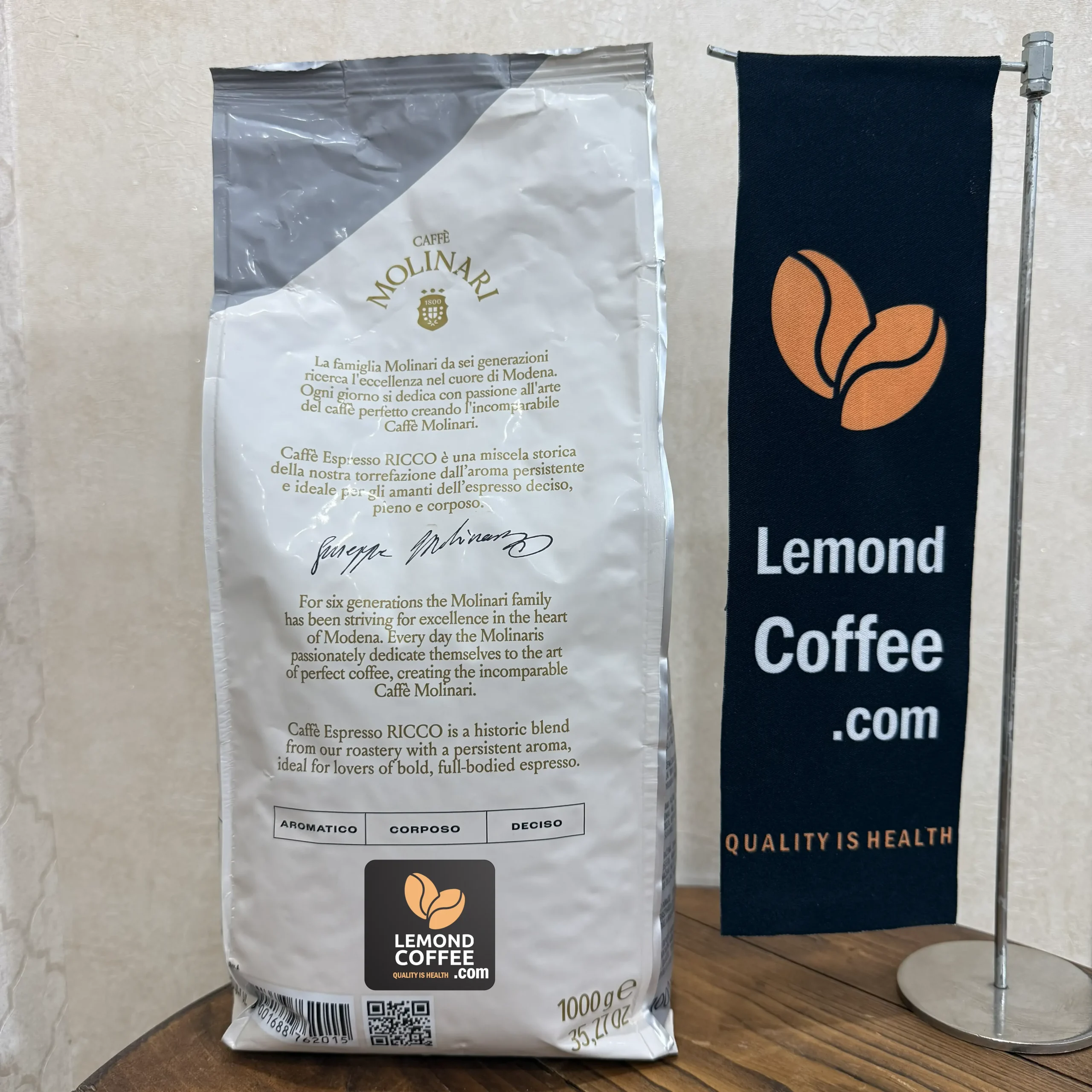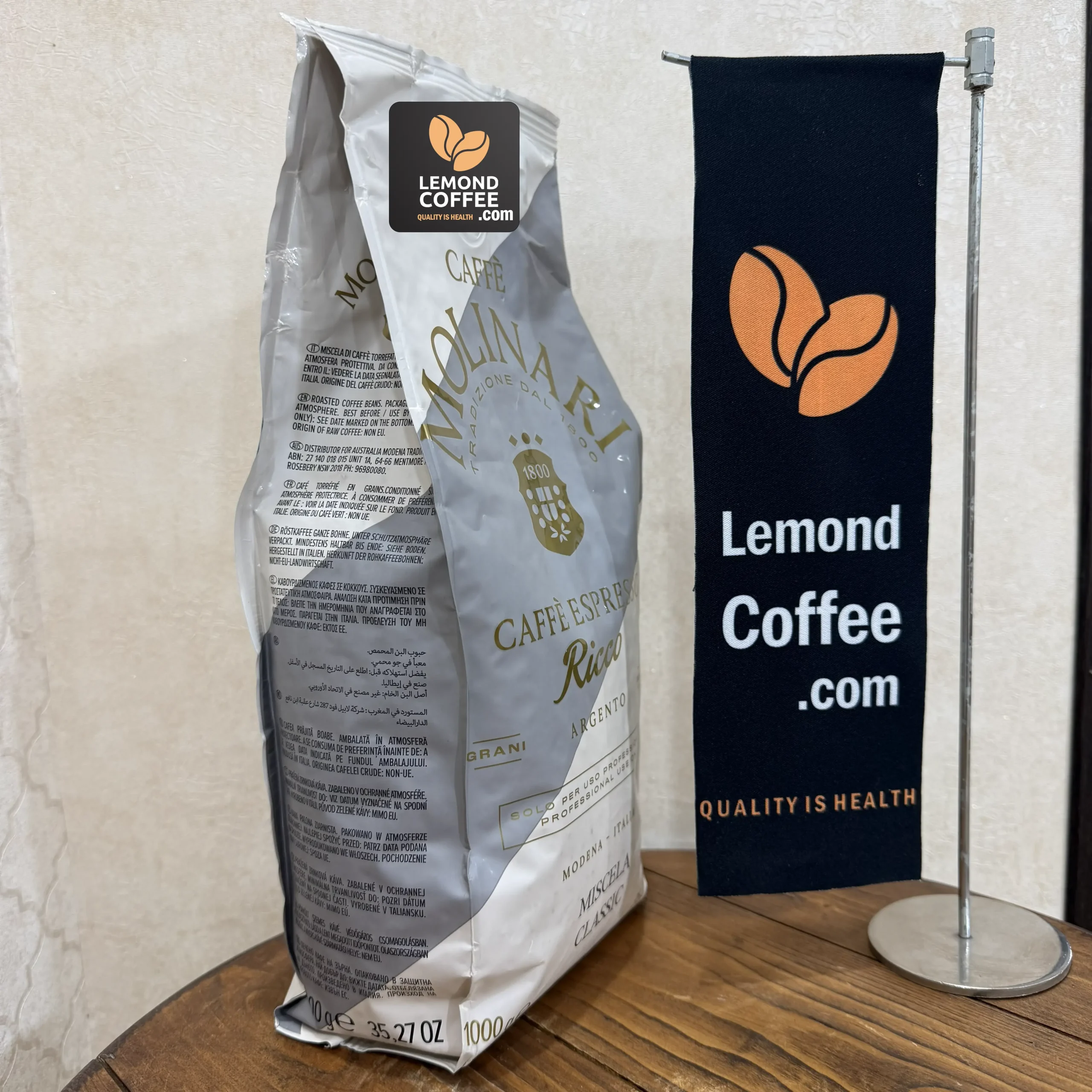 قهوه مولیناری ریکو Molinari Ricco با ترکیب 100٪ روبوستا، طعمی تلخ، کرمای ضخیم و کافئین بالا دارد؛ انتخابی حرفهای برای اسپرسوی اصیل ایتالیایی.